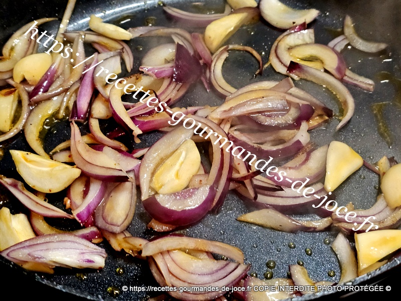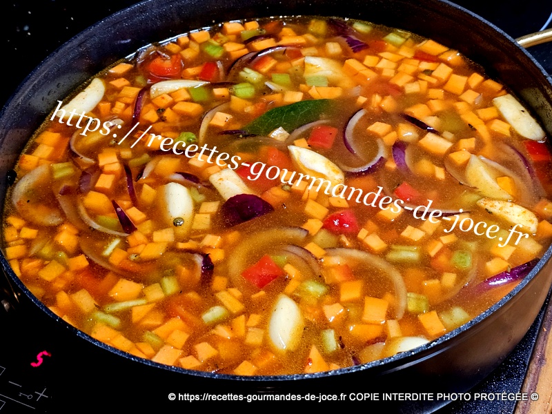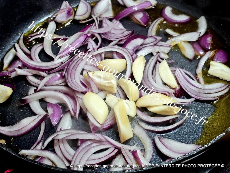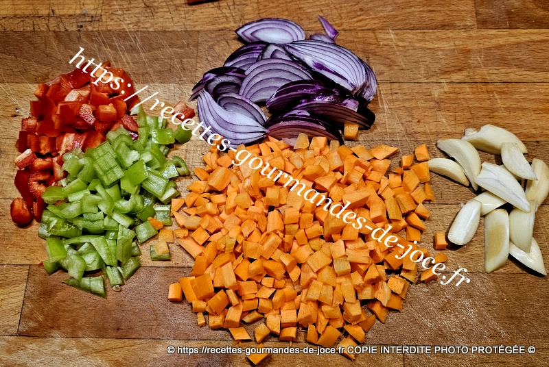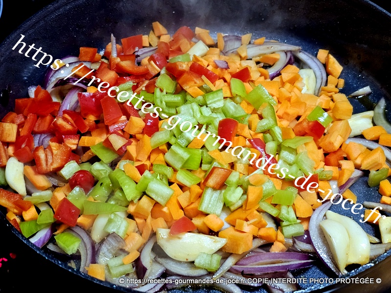 À la place, mettre les oignons et l’ail, les faire dorer. Ajouter ensuite les carottes, les poivrons et bien mélanger, laisser suer quelques instants.