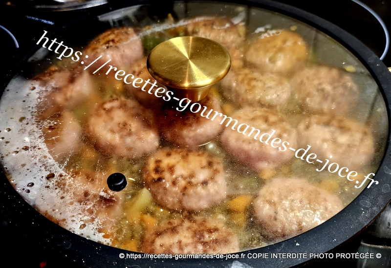 Ajouter les mini burgers, un peu d’eau si besoin et remettre le couvercle, poursuivre la cuisson environ 10 minutes à couvert et à feu doux.